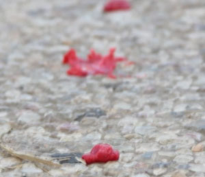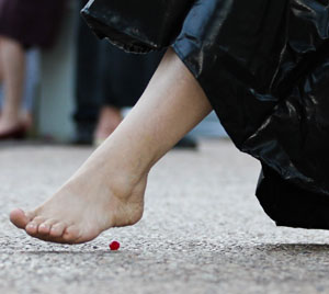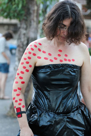 Line of Dots The performance was planned as a walking action into an unknown destination. For me it contained an element of anxiety. I had no idea how far I would venture, where I will end up, who I will meet. In order to mark the route I placed on the ground little red balls - hard candy - and then I crushed them by stepping over each one, imprinting each step on the street. Each step was branded on my body as well, via a red finger print. The audience was invited to participate and mark out the next step I should take. The journey turned into a pleasant and open event. The end was unpredictable, but rather natural: a journey into a car was marked out for me, and I was driven to the starting point. View video