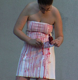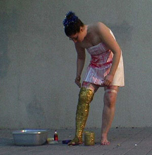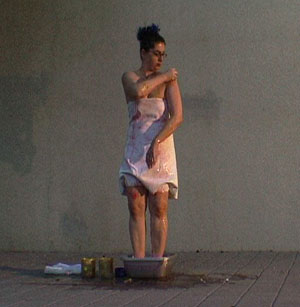 מצילחיים בסדרת פעולות טקסיות, צברתי והסרתי שכבות, מערבבת אירוניה ואמונה, עד שהדמות בשמלה הלבנה הפכה ל"וונדר וומן" שמאנית. כיוונתי את זמן ההתרחשות לתפר שבין היום והלילה. ראשית ניקדתי את גופי במדבקות שחורות שהוצאתי מתחת לשמלה, ואז הסרתי אותן מעורי ומסרתי לצופים. (פעולה זו תהפוך לדימוי עצמאי – ניקוד) אחר כך נקשר השיער בכחול מנצנץ, על השמלה טפטפתי צבע אדום שחרץ אותה בפסים מדויקים, ואת רגלי הזהבתי. מיד בסיום המלאכה שטפתי ממני את השינוי כולו.