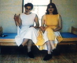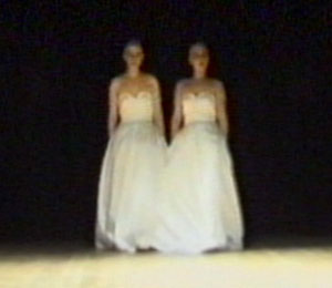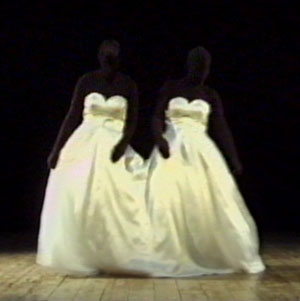 Who (Blacks). In the video-performance "Who", I shared a double, glamorous dress with my sister. We marched back and forth on the stage at the kibbutz auditorium, presenting and being presented, appearing and disappearing, challenged by the need to move together and in close proximity, in an elusive zone of power and vulnerability.