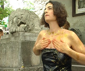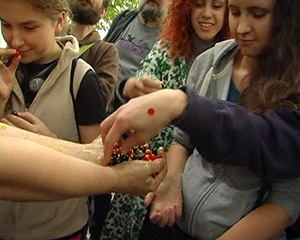 Offers I began with a familiar and controlled ritual of dotting my body with black and red dots and then transferred them to the audience, placing them on individual bodies. Then I offered black marbles and red candies that would not attach to the body, gaining a presence of their own by spreading and collecting. I offered gold ointment to make marks on my body. Eventually I mixed everything I had: gold, water, gel, melting candies and marbles, and handed the disgusting-desirable objects to the audience.