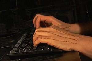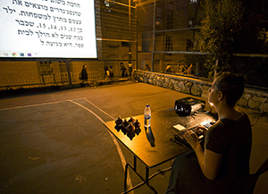 Transcriber The action took place at the Bio-Library, an arena for intriguing interpersonal encounters, between "human books" that told their stories and "readers" who chose to listen and participate. In addition to creating performative guidelines for the event and directing the "librarians", I created for myself a role that I called The Transcriber. I walked among the participants, collecting pieces of conversations and typing them as new and anonymous text. The text was presented on a screen outside the library and it disappeared when the library closed for the day. The title of the work alluded to my family name, which is related to writing and transcribing. The title was also related to the fact that the work was created at a time in which I was dwelling on writing an actual academic text. As an artist I chose to work with the fluid, transparent and abstract features of the text. View video