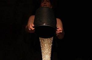 Work on Time This work had been planned for a festive event and it was not easy to decipher – which body material, what time, what place would be appropriate (or inappropriate) for this particular event. I concocted material from left over liquids that remained from previous works. At the beginning I stood at the top of a very clean staircase and cast a stream of black-gold material, a new and temporary addition to the building. The moment expired forever. I stayed in my nice garment with the leaking material on the staircase, no longer clean, no longer exact, wondering what to do with the rest of the allotted time. View video