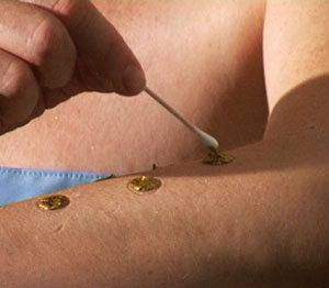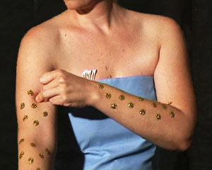 Golden Wounds In this performance piece I asked the audience to mark their own gaze - their decision to watch - by pressing a sharp metal stencil onto my skin. The action, which requires application of force, an intimate physical encounter, and discomfort, allowed a moment of boundary crossing between me and the audience. In order to preserve this moment, I captured and set the encounter in gold paste. With and without the aid of the audience, I continued until the time I allocated for the action was up, imprinting all the gazes that could have occurred in this time frame. View video