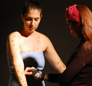 פצעי זהב בעבודה זו ביקשתי מן הצופים לסמן את מבטם, את בחירתם לצפות, על ידי לחיצה של שבלונה מתכת חדה על עורי. הפעולה, שכרוכים בה הפעלת כוח פיזי, מגע אינטימי, ואי נוחות גופנית, איפשרה רגע של חציית-גבול ביני לבין הצופים. כדי לשמר את הרגע הזה, קיבעתי את המפגש ואת הפעולה בעזרת משחת זהב. בעזרת הצופים או בלעדיהם, המשכתי לסמן עד תום הזמן שהקצבתי לפעולה, את כל המבטים שיכלו להתרחש. לצפייה בוידאו